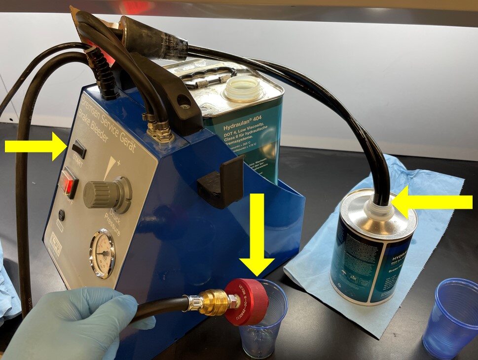 注将吸入软管放在新制动液的储液容器中,将加注适配器固定在空的储液容器上方,按住启动按钮直至加注了约 200 毫升制动液。