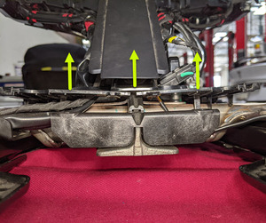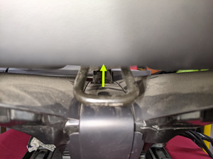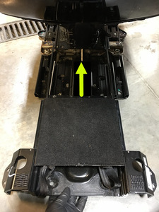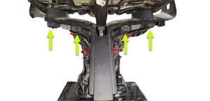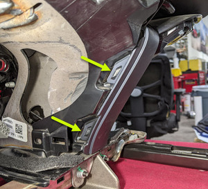 注稍稍抬高饰板,以便能够着。拆下底部撑杆时,一边向前滑动,一边稍稍向上旋转前端