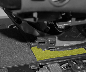 注稍稍抬高饰板,以便能够着。安装底部撑杆时,先稍稍向下旋转前端,然后向内滑动