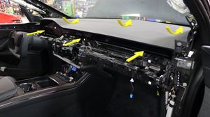 4 个固定销,将仪表板总成滑入车内,确保副驾位气囊和驾驶位出风口总成有通过下部仪表板分总成的间隙,建议请助手帮忙