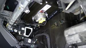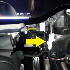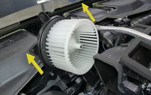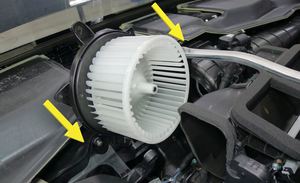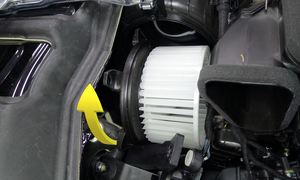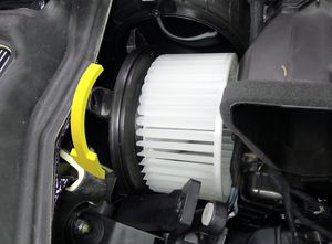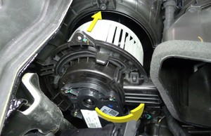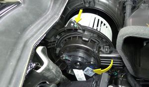 将电机向下旋转,绕过 HVAC 装置总成,穿过制动踏板总成,进入 HVAC 总成。