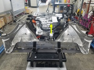- 使用起重机架,降下驱动单元吊索工具,小心地将后驱动单元放入后副车架,根据需要排布高压线束和冷却液软管。