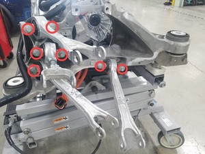 - 松开副车架举升机前部的系带和后部的两条系带,然后在协助下,将后副车架从副车架举升机上拆下。
