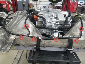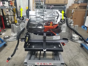 - 使用起重机架,升起驱动单元吊索工具,小心地将后驱动单元从后副车架中抬出,根据需要排布高压线束和冷却液软管。