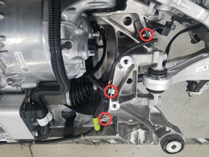 - 在后续步骤中,请他人协助支撑,承担左后转向节的重量,拆下将左后下尾连杆固定到转向节的螺栓。