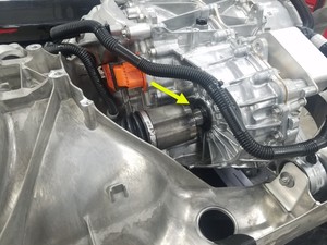 - 将后副车架电气线束连接到后驱动单元解析器连接器,紧固锁片,然后紧固将电气线束固定到后驱动单元电机的夹子(2 个)。