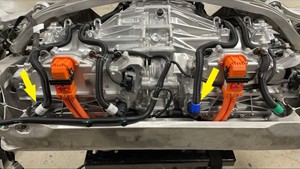 - 松开将后驱动单元变流器进口软管固定到后副车架的卡子(9 个),然后将软管从副车架前部拆下。