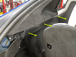 - 松开将左侧 C 柱中间饰板连接到左侧 C 柱中部支架上的卡子(9 个),然后将 C 柱中间饰板从车上拆下。