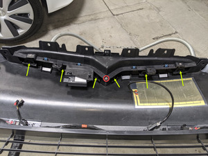 - 将前饰板 V 型件放置到前饰板 T 型标志支架上,然后安装用于将 V 型件固定到 T 型标志支架上的卡子(4 个)。