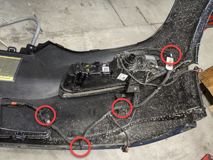 - 将左前雾灯安装到前饰板总成上,然后紧固用于将雾灯固定到总成上的锁片(4 个)。