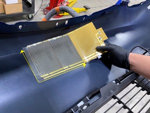 注将雷达加热器与前饰板上的蚀刻对齐。注确保没有折痕和气泡。