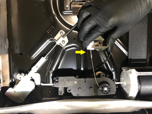切断用于将左侧第三排座椅靠背调节传动装置线缆固定到座椅支架上的扎带,然后从支架上取下线缆