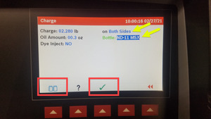 注输入在空调回收时记录的制冷剂和机油量;设置应与记录相符;选择两边加注;通过瓶子图标选择 ND-11 MSX;该过程完成后机器会发出蜂鸣声;车辆可以无人看管;如果需要,可以使用 "Dye Inject" 选项注入检漏染料。