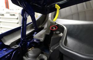 紧固位于左侧减震塔盖板上方的前围篦板清洗剂供给软管。