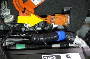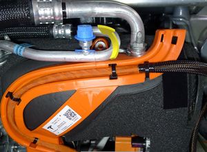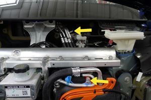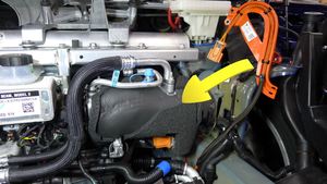 注1 个锁止电气连接器;将黑色锁片从空调压缩机上移开,向下推锁止连接器以释放,并直接从插座上拉出。