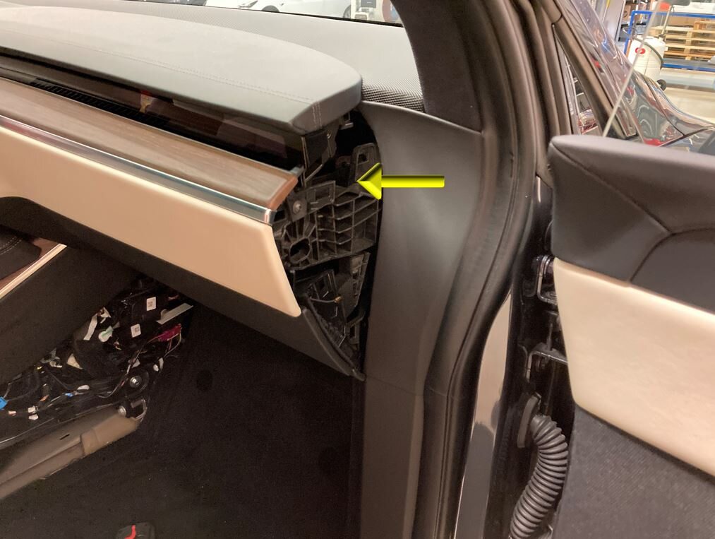 注1x clip, 1x bolt, 10mm, 9 Nm, Note routing behind center display RH bracket. If using part revision 1562948-70-D on a Non-AP4 vehicle, add ground strap 1679240-00-A to aero lens assembly