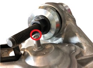 注设置套管拆卸工具,使轴承远离驱动单元。注螺纹杆距离后驱动单元 (RDU) 组件非常近,如果从驱动单元侧推出套管,可能会损坏该工具/后驱动单元 (RDU)。