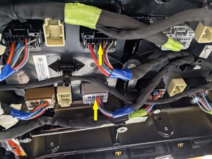 将 LH 后车门电源支柱线束放入车内,连接连接器 (x2),然后安装夹子 (x5) 和丁基粘贴片。