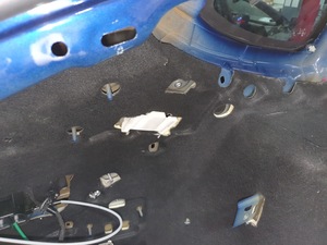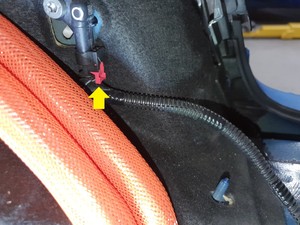 - 松开连接左侧行李箱侧饰板地毯的推拉式卡子(4 个)和电气连接器。