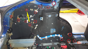 - 紧固将左侧车身线束固定到 C 柱下部的卡子(12 个),然后连接电气连接器(3 个)。