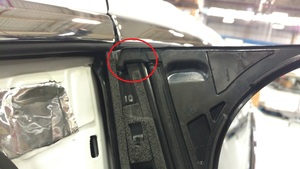- 将饰板密封件固定到左侧 B 柱饰板中。使用 P-80 乳化剂,有助于密封件安装。