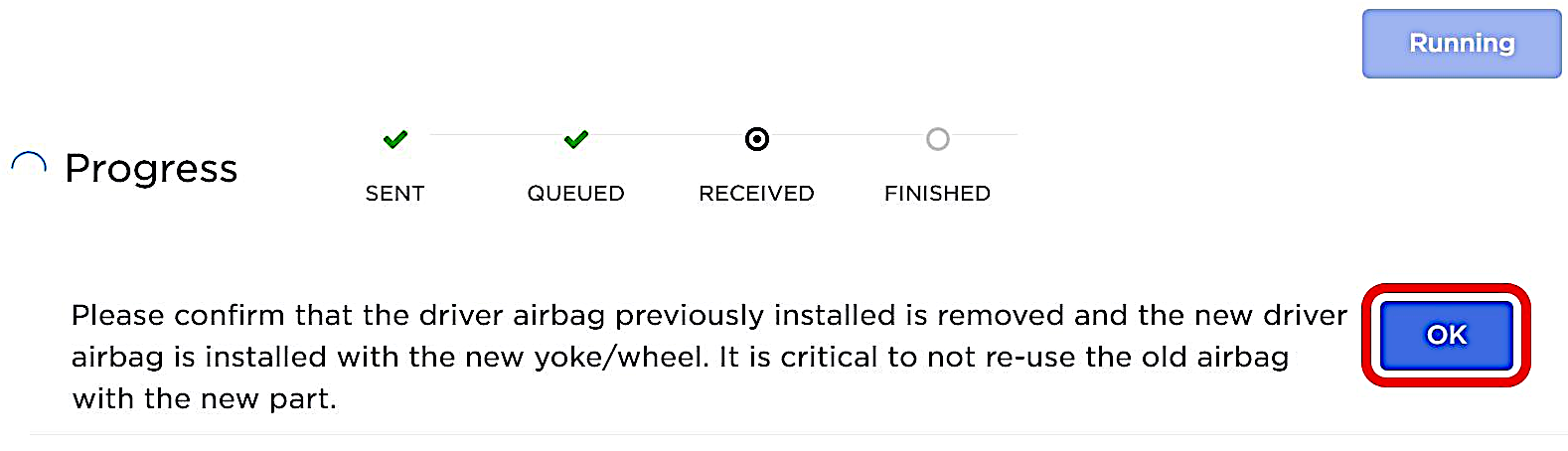 - 阅读页面信息并确认新驾驶位安全气囊的确兼容,点击OK,然后等待例行程序完成。