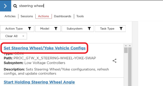 - 在 Toolbox 中,点击Actions选项卡,在搜索字段中输入 “steering wheel”,然后点击Set Steering Wheel/Yoke Vehicle Configs。