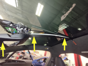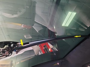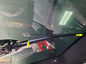 - 将后视镜线束盖放入车辆中,将盖向后滑入顶蓬,然后固定用于将盖固定到挡风玻璃支架的卡子(16 个)。