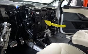 注通过副驾位前门安装暖通空调 (HVAC) 总成的前端。逆时针旋转,向车辆前方安装。