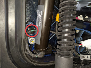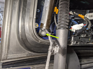 - 松开用于将左侧鹰翼门副支撑杆线束固定到车门总成上的卡子(2 个)。