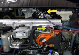 注将空调压缩机高压线束支架朝车辆前部移动,提起支架以脱离支架上部支座,然后小心地将线束和支架置于一旁。