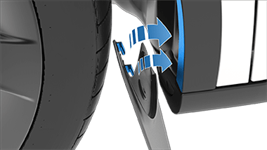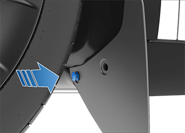 - 将挡泥板移入位,以使挡泥板上的锁片进入前翼子板饰板后侧。确保挡泥板准确对齐前侧轮拱内衬和车身上的孔。