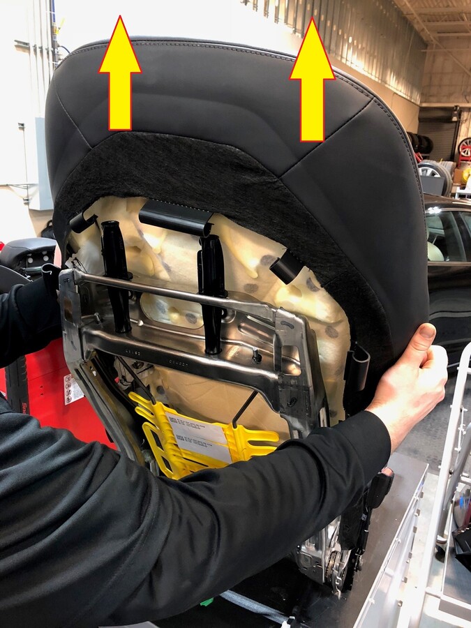 注首先,将泡沫饰板垂直滑入座椅靠背框架。确保头枕柱与座椅靠背泡沫接合。务必将与框架接合的加热器线束及下饰板推入框架背面。