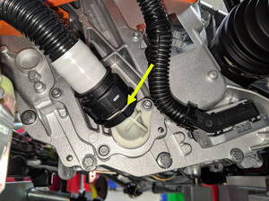 - 将软管塞从后驱动变流器入口软管上拆下,等待冷却液从软管中排出,然后将软管连接到液力联轴节并固定弹簧夹。