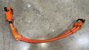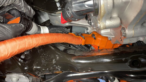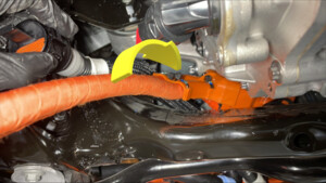小心地将高压电池至后驱动单元高压线束从周围组件中移出,然后从车上拆下该线束。