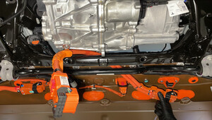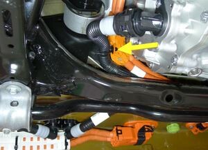 小心地将高压电池至后驱动单元高压线束放入车内。