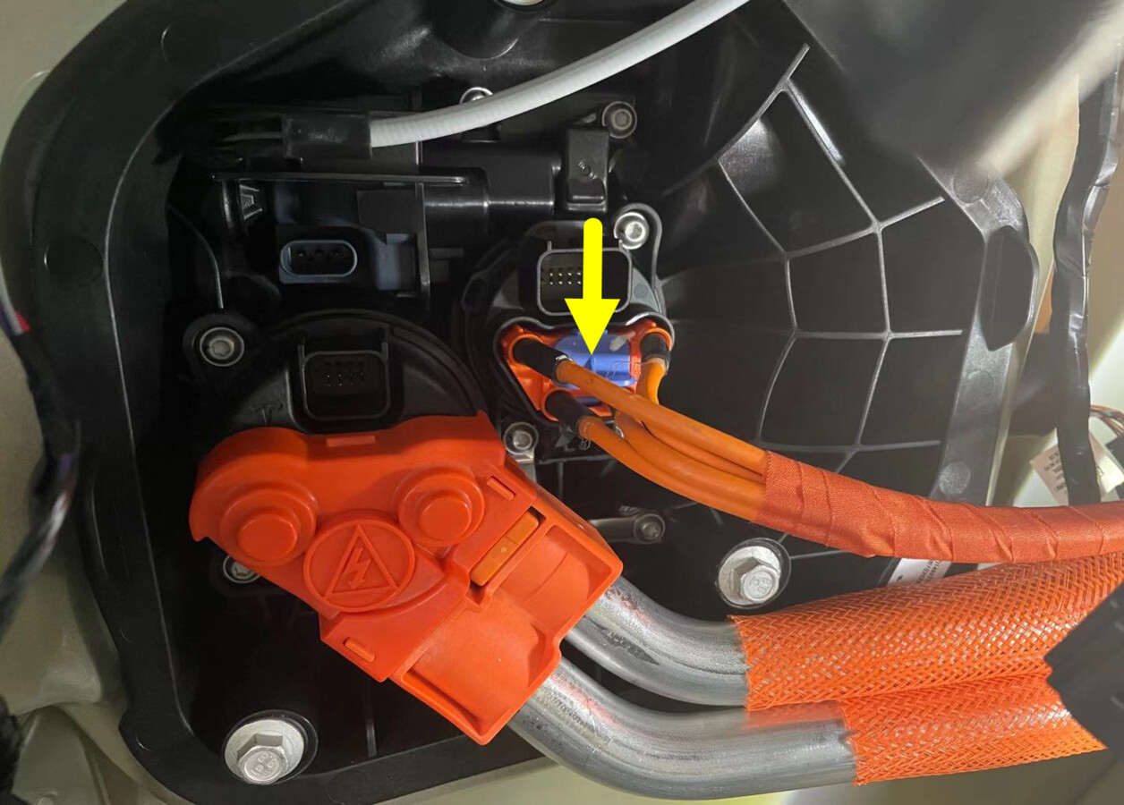 在充电接口处,使用 Hioki 电阻计测量充电接口母排引线与充电接口母排螺柱之间的电阻。另请对其他引线和螺柱执行该测试。