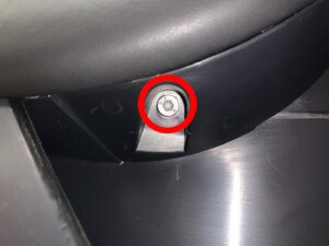 松开将螺钉盖板固定到 LH 后车门扶手中间的夹子,然后从扶手上拆下螺钉盖板。