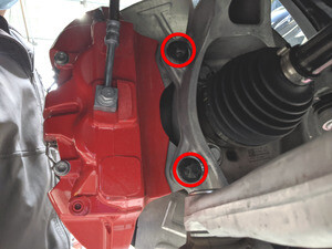 - 拆卸并弃置将左前制动钳固定到左前转向节的螺栓(2 个),拆下制动钳,然后用 S 型挂钩将该制动钳挂到一旁。
