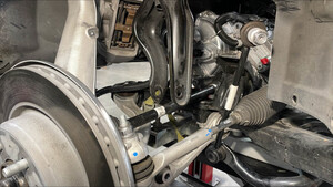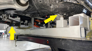 在协助下,小心地降低前副车架,然后从车底移出副车架举升工具。