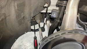 测量翼子板底部到前轴中心的距离,调整托臂支架,将前悬架设置在行驶高度。
