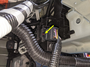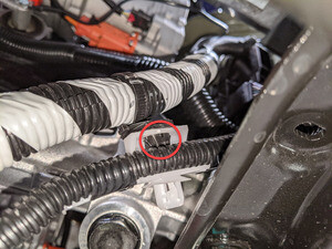 10 Nm (7.4 lbs-ft) - 将电气线束连接到左前纵梁支架连接器,然后紧固左前纵梁支架另一侧的红色锁片。
