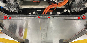 - 拆卸将前车底护板固定到高压电池的螺栓(6 个),然后将车底护板从电池上拆下。