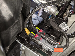 - 将电气线束连接到转向机电源连接器(2 个),然后滑动红色锁片以锁定连接器。