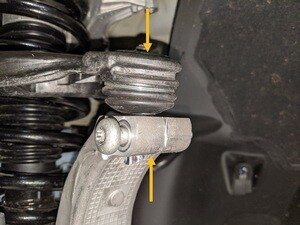 紧固将左前减震器固定到下控制臂的螺栓和螺母,然后用油性记号笔标记螺栓和螺母。