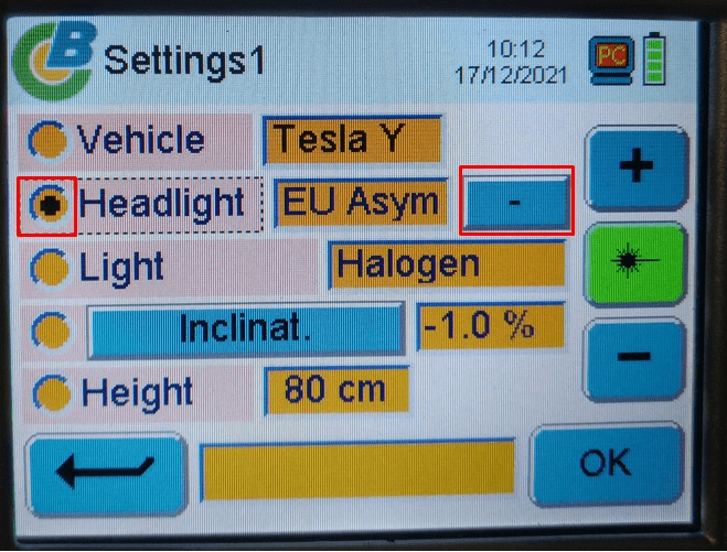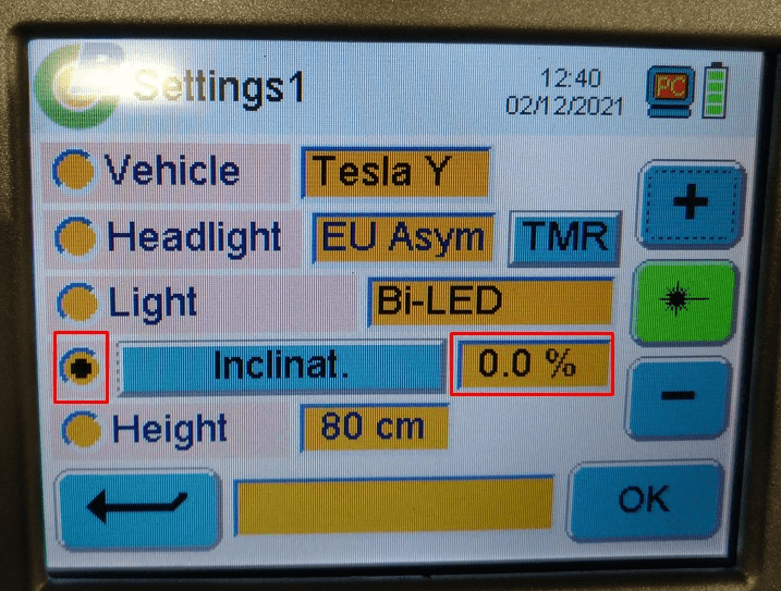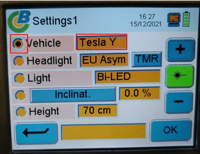 - 在前照灯测试仪工具上,选择Vehicle,然后使用+或-按钮将车辆类型设为Tesla Y。