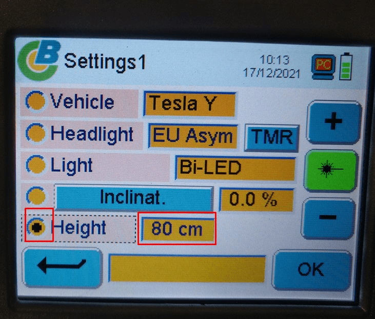 - 在前照灯测试仪工具上,选择Height,然后使用+或-按钮将高度设为81 cm。