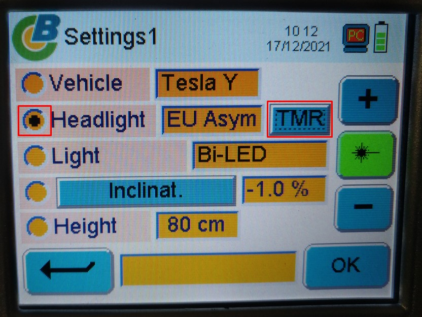- 在前照灯测试仪工具上,选择Headlight,使用+或-按钮将前照灯类型设为EU Asym,然后使用EU Asym字段旁边的小-按钮选择TMR。