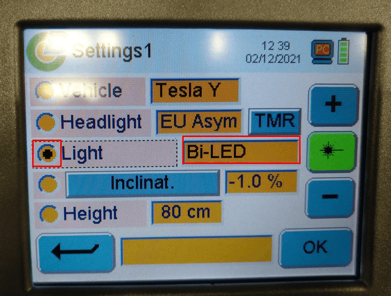 - 在前照灯测试仪工具上,选择Light,然后使用+或-按钮将车灯类型设为Bi-LED。