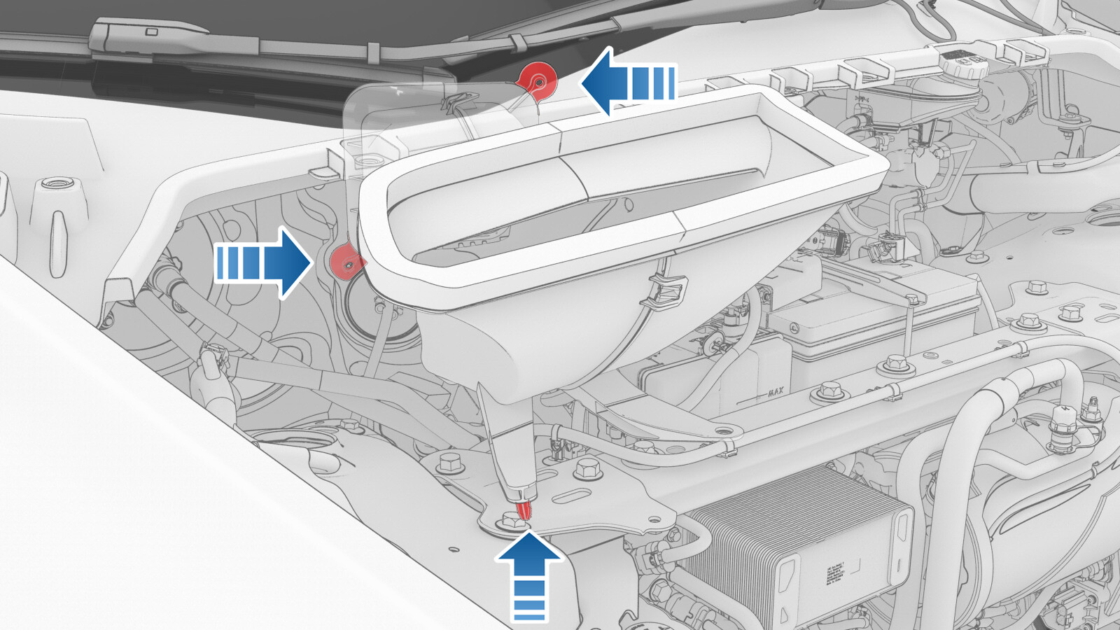 - 慢慢松开将新鲜空气进气槽连接到车辆的夹子 (x2) 和销,然后从车上拆下进气槽。